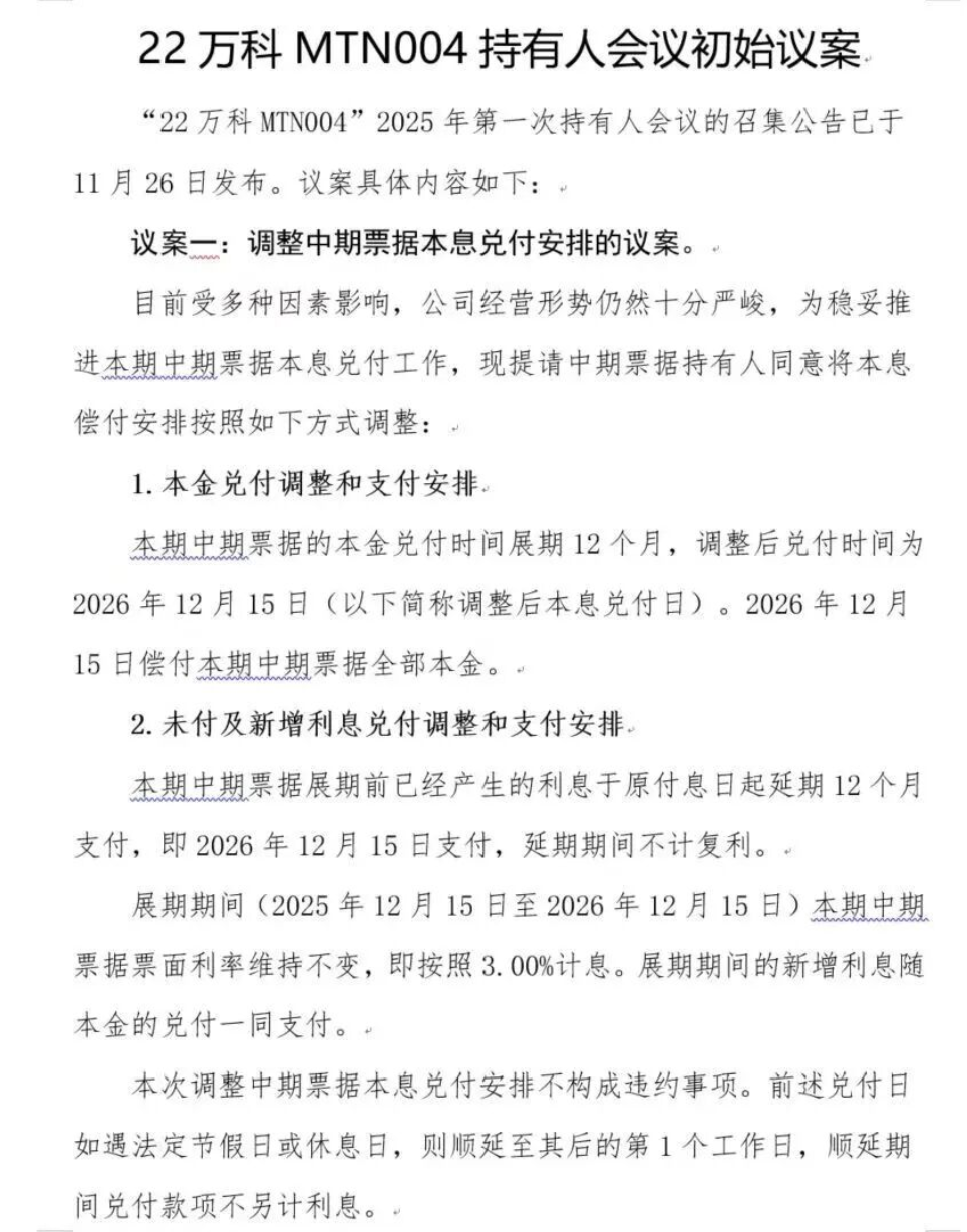 当天,一份名为《“22万科MTN004”持有人会议初始议案》在市场间流传。其中《议案》所提及该笔中期票据本息兑付时间递延12个月等核心条款,与上述报道披露一致。《议案》还表示,如本议案获得本次持有人会议通过,则视为各持有人同意继续持有本期中期票据并接受本议案约定的本息兑付安排,“不触发本期中期票据相关违约责任”。