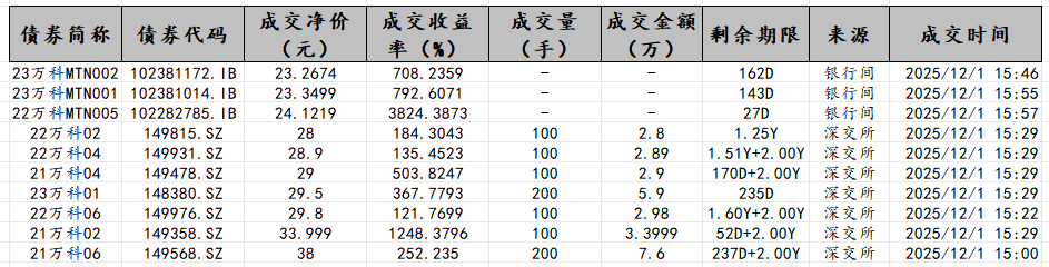 债券方面,12月1日,包括“21万科04”及“22万科02”因首次下跌达到或超过30%而触发临停,“21万科02”则因首次下跌达到或超过20%触发临停。DM终端显示,目前万科境内债价格普遍跌破30元。