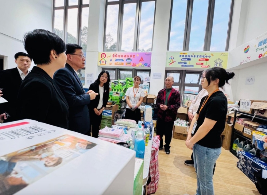 李家超亦视察了由活动室改设的临时物资中心,当中存放着各界捐赠的生活用品。他亲切赞扬负责营运的社福机构职员、社工,以及主动协助新迁入灾民的“双鱼荟”邻舍居民, 指他们在关键时刻迅速动员,为灾民提供从生活所需到情绪支援的全面帮助。