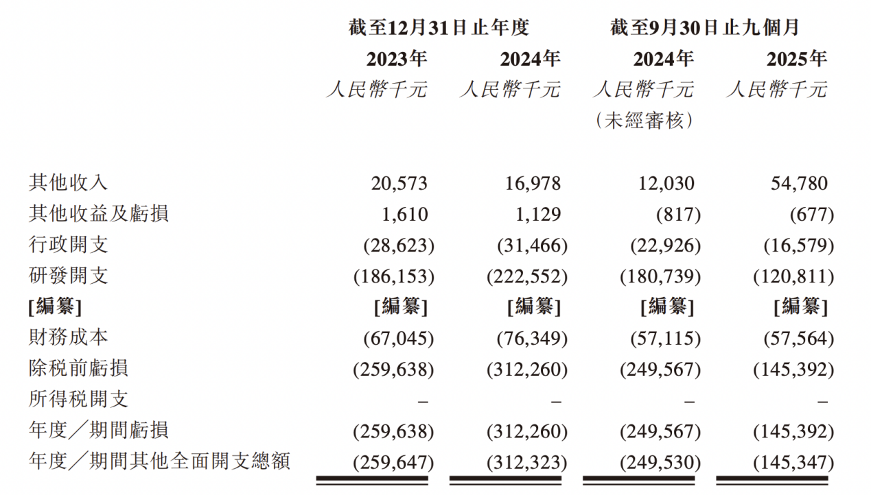 业绩方面,2023年、2024年及2025年前9月,凌科药业其他收入分别为2057.3万元、1697.8万元、5478万元;研发开支分别为1.86亿元、2.23亿元、1.21亿元;年度/期间亏损分别为2.6亿元、3.12亿元、1.45亿元。