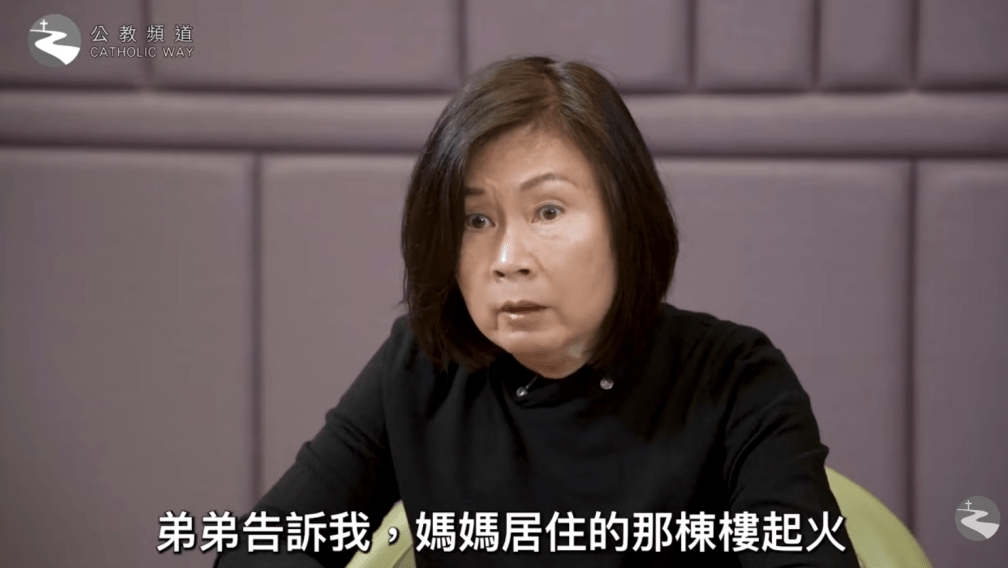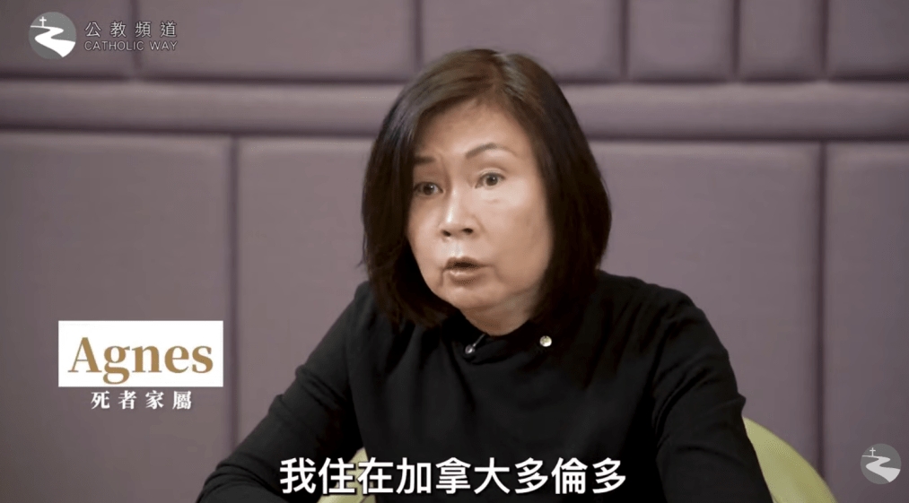 ▲婆婆的女儿Agnes在公教频道忆述女儿忆述骤失至亲的悲痛历程,感谢香港市民,“与哭泣的一起哭泣”,又呼吁生者振作,因为未来“条路几漫长”。