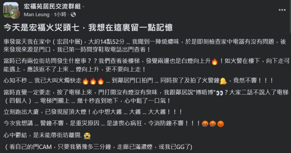 这名居民在Facebook群组“宏福苑居民交流群组”分享逃生一刻,表示自己居住宏昌阁中层。事发当日下午约2时52分,他在家中闻到烧焦味,检查后发现气味来自门口。他立即与两位街坊查看后楼梯,发现两边均有白烟向上升。他意识到火警可能来自楼下,判断向下逃生可能遇险,而烟向上蔓延亦不宜往上走。