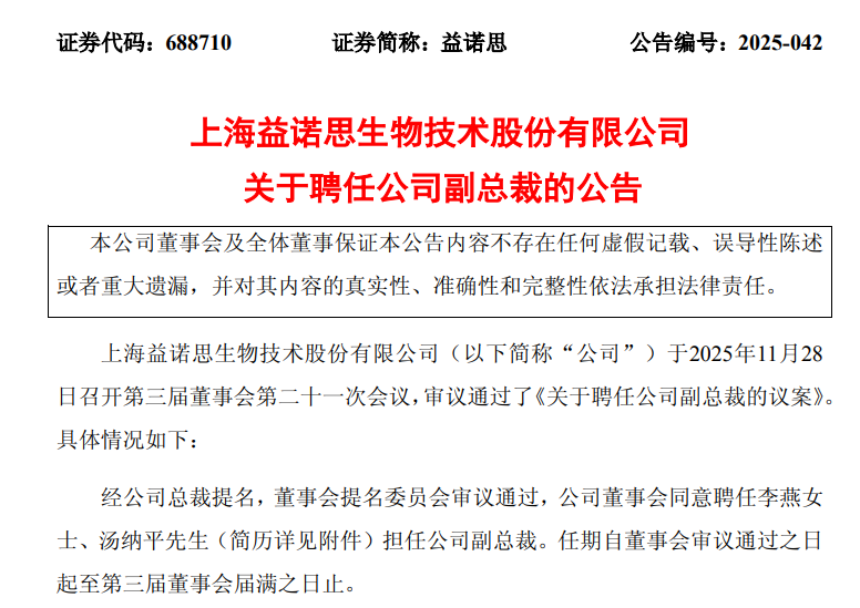公告显示,上海益诺思生物技术股份有限公司当日召开第三届董事会第二十一次会议,审议通过《关于聘任公司副总裁的议案》,同意聘任李燕、汤纳平担任公司副总裁,任期自董事会审议通过之日起至第三届董事会届满之日止。