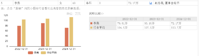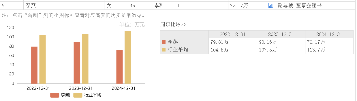 据东方财富网数据,李燕2024年所获薪酬为72.17万元,相较上年薪酬90.16万元降薪19.95%。