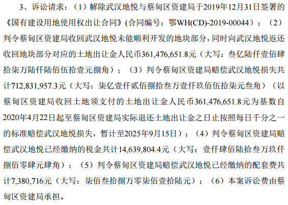 公告显示,其诉讼请求主要包括以下四点:请求解除双方于2019年12月31日签署的《国有建设用地使用权出让合同》;请求判令蔡甸区资建局收回武汉地悦未能开发的地块部分,并返还相应土地出让金约3.61亿元;请求判令蔡甸区资建局赔偿以应返还土地出让金为基数计算的损失,暂计至2025年9月15日约为7.13亿元(按每日千分之一的标准计算);请求判令蔡甸区资建局赔偿武汉地悦已缴纳的税金1463.98万元和配套费738.07万元。