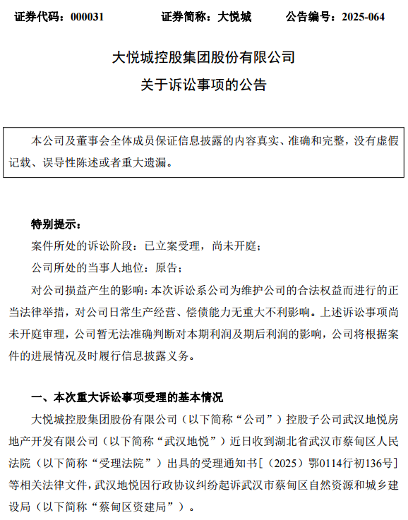 12月3日晚间,大悦城发布《关于诉讼事项的公告》(公告编号:2025-064),其控股子公司武汉地悦房地产开发有限公司(以下简称“武汉地悦”)已就行政协议纠纷,正式起诉武汉市蔡甸区自然资源和城乡建设局(以下简称“蔡甸区资建局”)。湖北省武汉市蔡甸区人民法院已受理此案【(2025)鄂0114行初136号】,目前,案件处于已立案尚未开庭阶段。