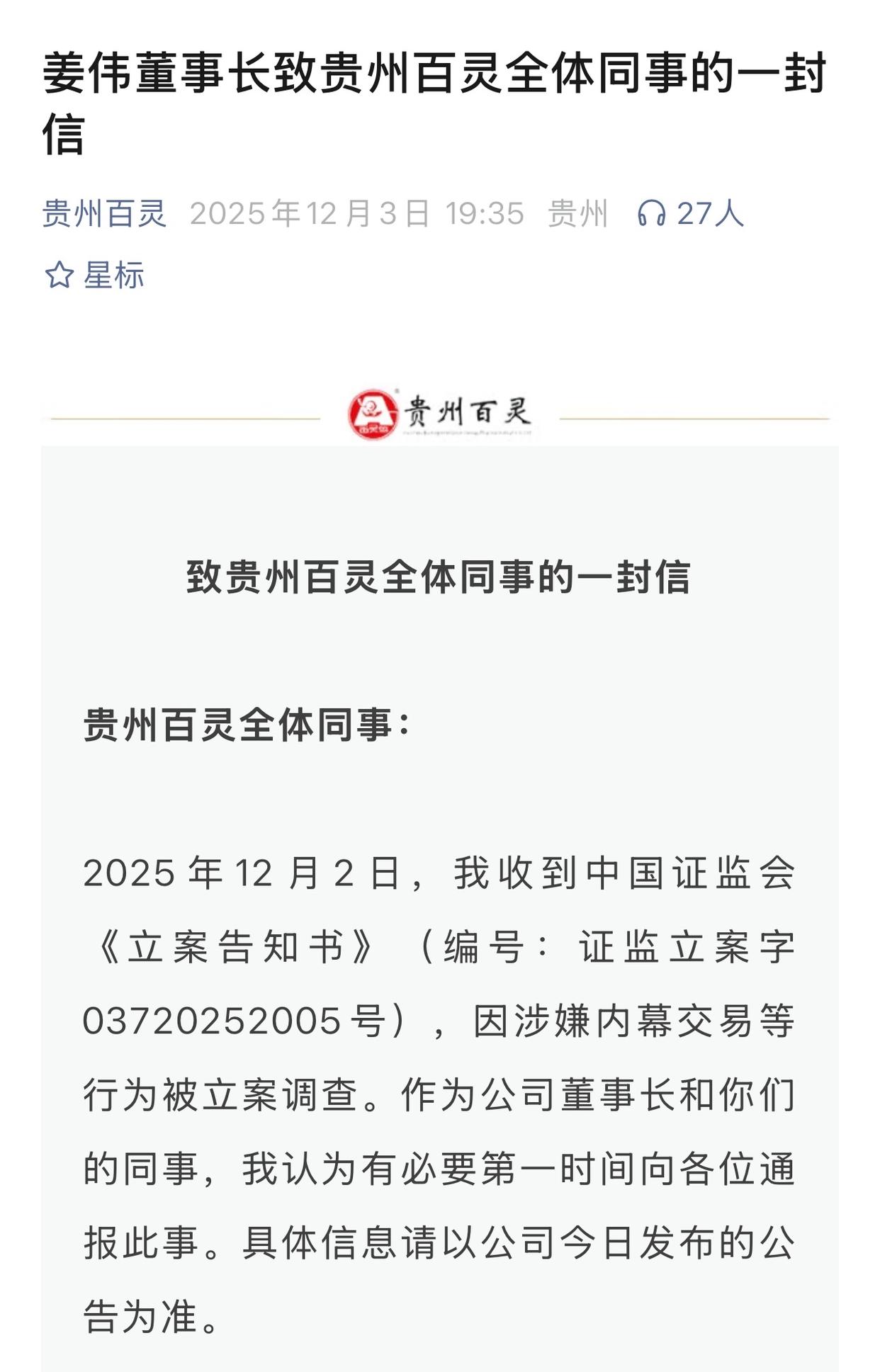 昨日晚间,“贵州百灵”微信公众号同步发布了董事长姜伟致全体同事的一封信。姜伟在信中称,他将全力配合证监会的调查工作,并坚信监管部门会依法依规、客观公正地查明事实,给出公正结论。
