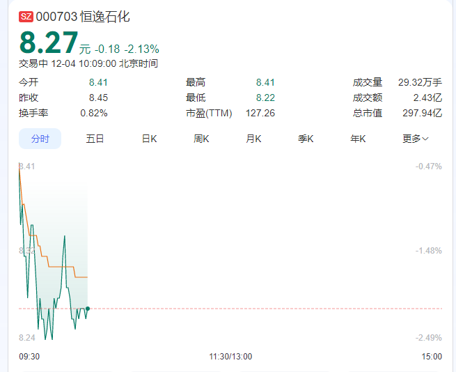 截至发稿,恒逸石化股价报8.27元/股,跌幅2.13%,最新市值约297.94亿元。