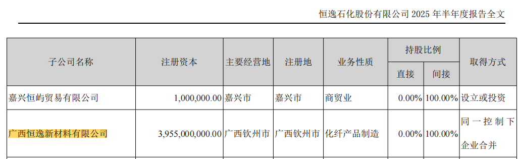 截至2025年上半年,广西恒逸新材料有限公司的注册资本为39.55亿元,注册地为广西钦州市,主要业务为化纤产品相关经营,恒逸石化通过间接持股方式持有该公司100%的股权。
