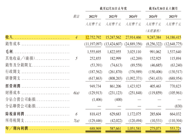 成立第7年,公司业绩已进入高速增长期。2022至2024年以及2025上半年,公司收入分别为127.53亿元、152.48亿元、279.14亿元,141.86亿元;利润为6.89亿元、5.88亿元、10.52亿元、5.54亿元。2024年营收净利均实现大幅增长。