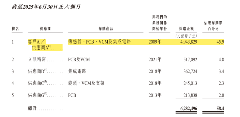 同时,“客户A”也是立景创新的最大供应商,采购额占比达45.9%。也就是公司销售和供应两大命脉都高度集中在“客户A”一家之上。