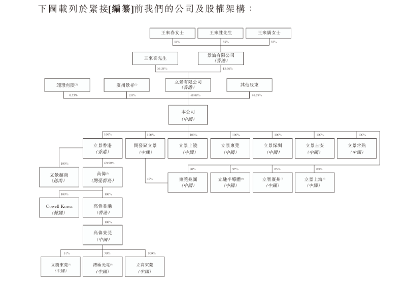截至最后实际可行日期,立景创新由立景有限公司持有约48.06%。立景有限公司由王来喜拥有约56.34%,景汕有限公司(王来春拥有34%、王来胜拥有33%及王来娇拥有33%)拥有约43.66%。王来喜、王来春、王来胜及王来娇四个兄弟姐妹为一致行动人。