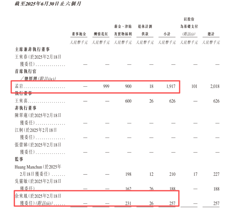 薪酬方面,2024年,孟岩薪金、津贴及福利等总额为106.7万元。2025上半年,孟岩获花红99.9万元,加上薪金等共计191.7万元;余来凤上半年薪金、津贴及福利等总额为25.7万元。