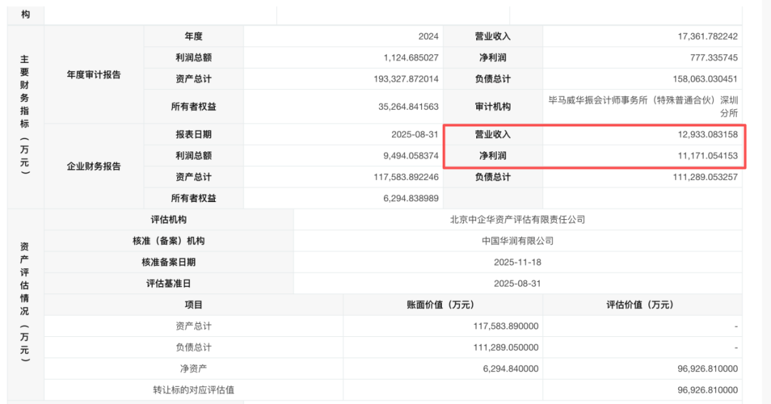 从财务数据来看,2025年前三季度,华润西安营收约为1.98亿元,净利润约229.53万元。资产评估报告显示,截至2025年6月底,华润西安资产总计约14.97亿元,负债总计约9.91亿元,净资产约5.06亿元,整体评估价值约8.85亿元,以9.7亿元的挂牌底价算,较评估价溢价约9.6%。