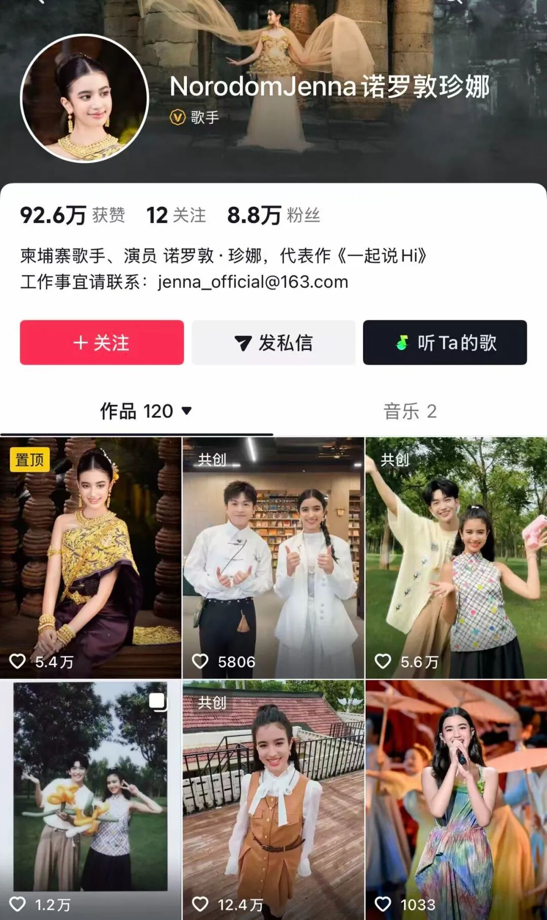 此外,珍娜公主在中国多个社交平台开设个人账号,分享日常生活,推介柬埔寨旅游资源以及传统文化。在视频中,她展示的柬埔寨仙女舞、祈福舞、高棉古典舞等传统艺术得到众多中国网友的好评。