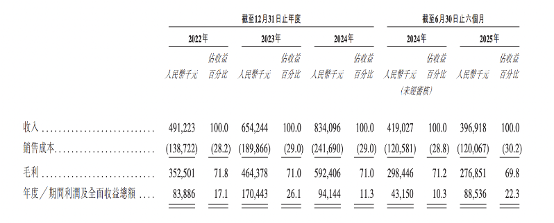 2022年至2024年,圣桐特医收入分别为4.91亿元、6.54亿元、8.34亿元;净利润分别为8388.6万元、1.7亿元、9414.4万元;毛利率分别为71.8%、71%、71%。