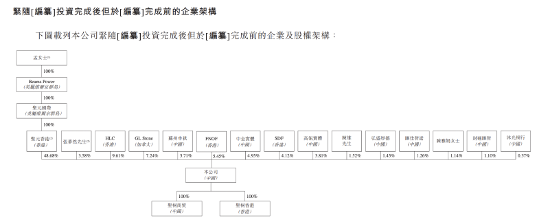 IPO前,圣元香港持股为48.68%,张梦然持股为3.58%。圣元香港是一间由圣元国际全资拥有的公司,而圣元国际则由BeamsPower全资拥有,BeamsPower则由孟秀清全资拥有。