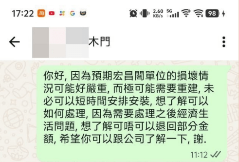 在对话截图中见到楼主向店家查询:“你好,因为预期宏昌阁单位的损坏情况可能好严重,而极可能需要重建,未必可以短时间安排安装,想了解可以如何处理,因为需要处理之后经济生活问题,想了解可唔可以退回部分金额,希望你可以跟公司了解一下,谢”。