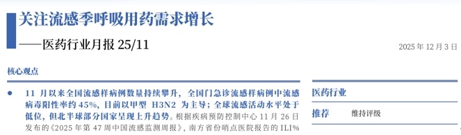 国家流感中心发布的中国流感监测周报显示,2025年11月24日至11月30日,我国流感活动继续上升;并预测今年秋冬流感高峰可能出现在12月中下旬至明年1月初,市场对抗病毒药物及对症治疗药物的需求大幅增长,特别是儿童作为流感易感人群,用药需求尤为迫切。