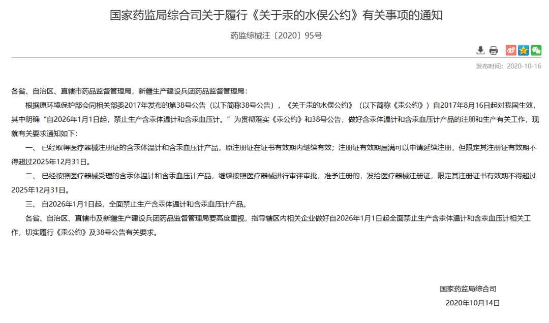 根据国家药监局综合司关于履行《关于汞的水俣公约》有关事项的通知,自2026年1月1日起,禁止生产含汞体温计和含汞血压计。通知要求: