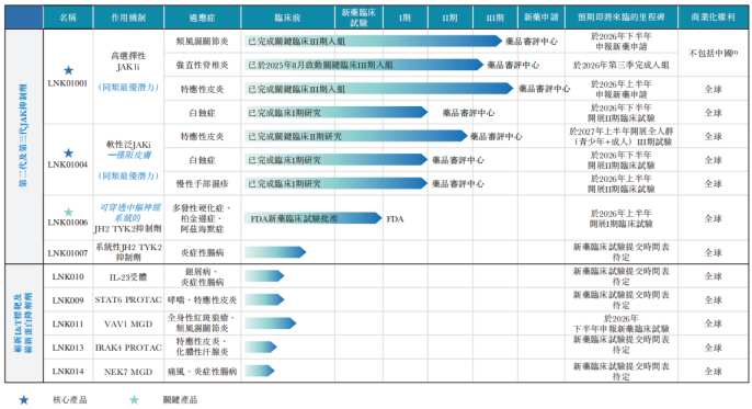此外,可穿透血脑屏障的TYK2抑制剂LNK01006已于2025年11月获FDA临床批件,拟拓展至神经退行性疾病领域,显示了公司向神经系统疾病延伸的布局意图。