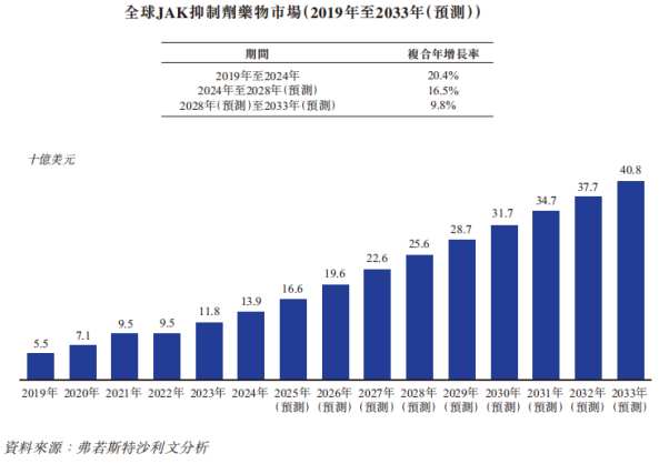 从市场规模来看,JAK抑制剂赛道展现出强劲的增长动能。据弗若斯特沙利文数据显示,全球JAK抑制剂市场规模已从2019年的55亿美元迅速扩张至2024年的139亿美元,预计到2028年将达到256亿美元,2033年有望突破408亿美元。中国市场的增长尤为显著,从2019年的4亿元人民币跃升至2024年的38亿元,预计2028年将达171亿元,2033年进一步攀升至465亿元,显示出巨大的临床需求与商业前景。