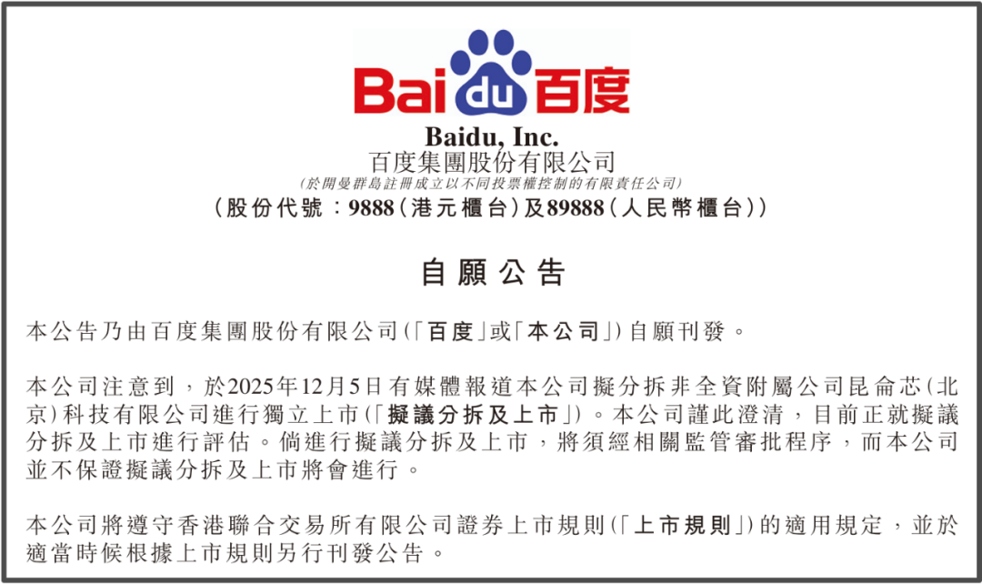 12月7日,百度回应称正在评估昆仑芯分拆及上市事宜,若实行将进行相关监管审批程序,但并不作出保证。