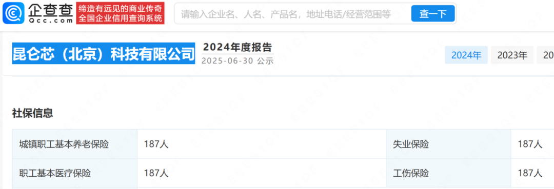 企查查显示,昆仑芯组建于2011年,其前身是百度芯片及架构部,由百度芯片首席研发架构师欧阳剑出任CEO。昆仑芯(北京)科技有限公司2024年报披露,为187人缴纳了社保。