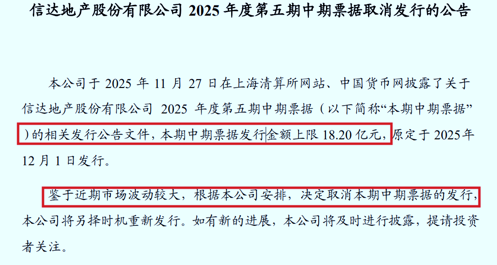 近日,信达地产股份有限公司发布公告,宣布取消原定于12月1日发行的中期票据,涉及18.2亿元募资额。对于取消发行的原因,公司表示系近期市场波动较大,后续将另择时机重启发行。