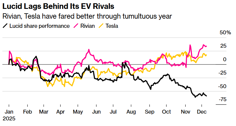 上图显示,Lucid落后于其电动汽车领域的那些最强劲竞争对手们,尤其是Rivian、特斯拉在需求动荡的一年中表现更好。