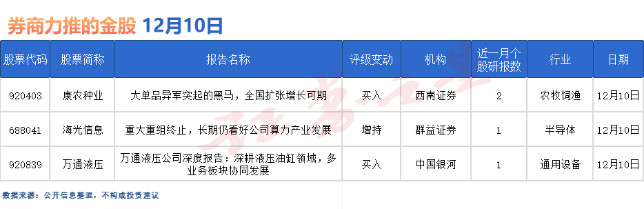 据证券之星数据库不完全统计,12月10日券商共给予3家A股上市公司“买入”评级。从行业分布看,券商12月10日关注的个股聚焦于农牧饲渔、半导体、通用设备等行业。