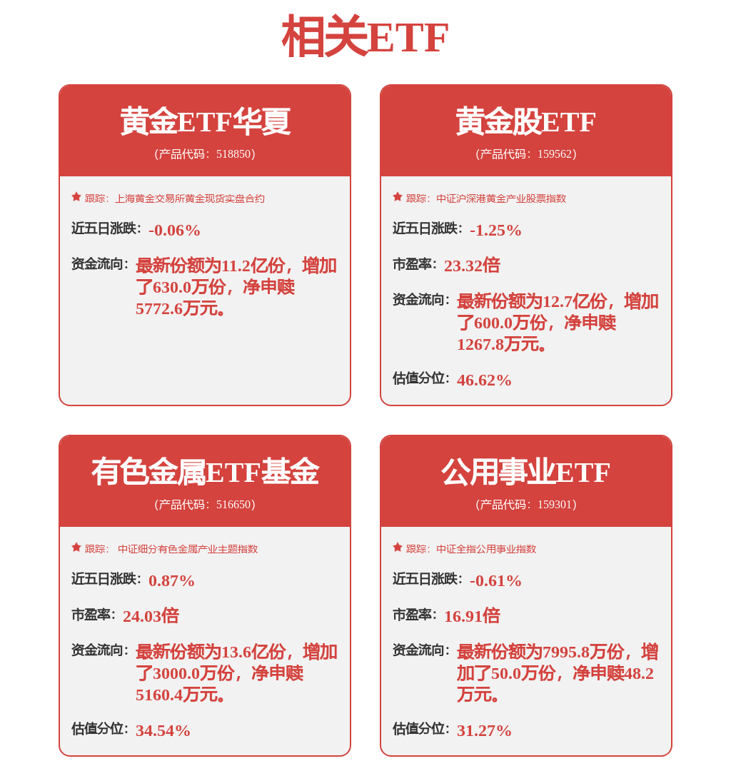 12月11日,受降息落地及鲍威尔鸽派言论催化,金铜价携手走强,银价再创新高,黄金有色相关ETF集体走强,截至9:46,黄金ETF华夏(518850)涨0.75%,有色金属ETF基金(516650)涨1.68%,黄金股ETF(159562)涨2.13%,其持仓股山金国际涨5.88%,株冶集团、赤峰黄金、紫金矿业等股纷纷走强。