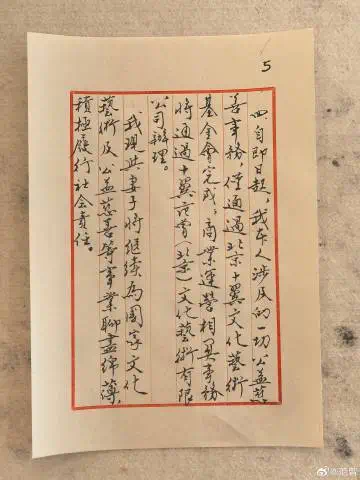 四、自即日起,我本人涉及的一切公益慈善事务,仅通过北京十翼文化艺术基金会完成;商业运营相关事务,将通过十翼范曾(北京)文化艺术有限公司办理。