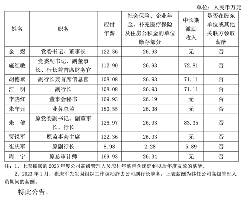同时,公告还披露了部分已离任高管的薪酬,如原党委书记、董事长金煜应付年薪118.64万元,社会保险、企业年金等单位的缴存部分26.19万元,合计144.83万元;原副行长汪明应付年薪122.35万元,社会保险、企业年金等单位的缴存部分26.19万元,中长期激励收入80.38万元,合计228.92万元。