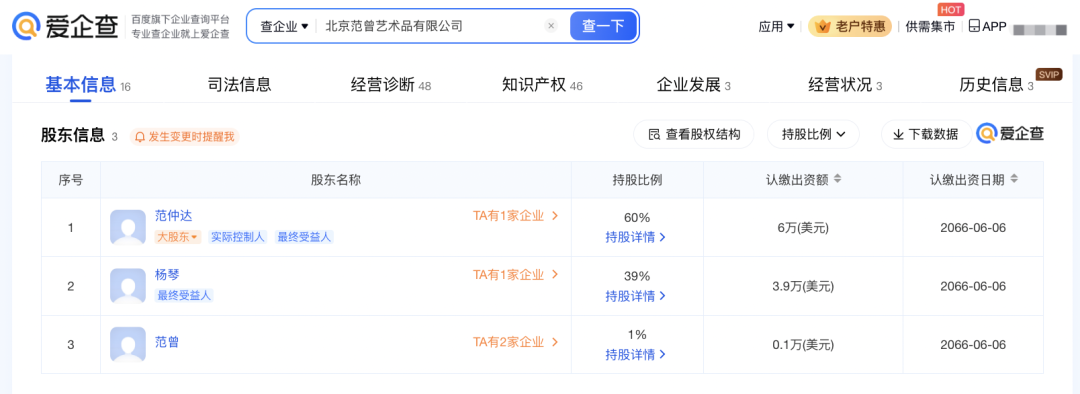 范曾此前还与此次表示将断绝关系的继子范仲达共同持股拥有一家名为北京范曾艺术品有限公司的企业。该公司于2021年12月成立,注册资本10万美元,目前仍处于存续状态,其中范仲达持股60%,范曾持股1%,另有一人(扬琴)持股39%。