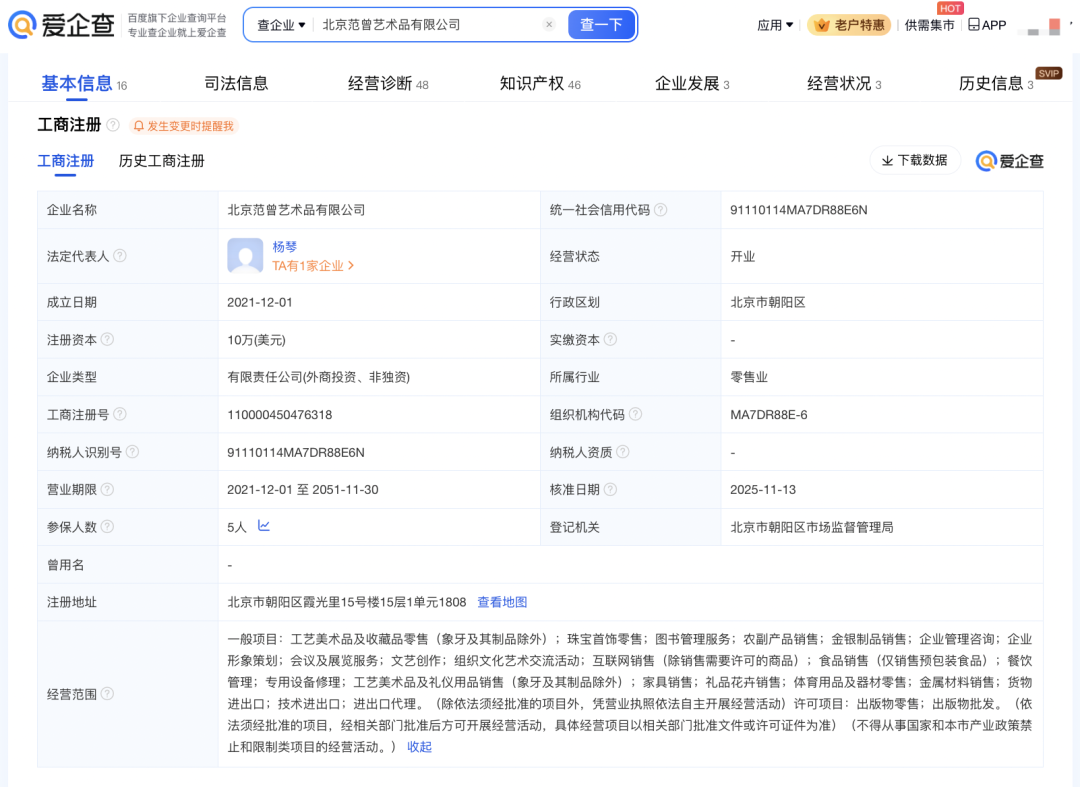爱企查App显示,十翼范曾(北京)文化艺术有限公司成立于今年12月2日,法定代表人为徐萌,注册资本100万元人民币,经营范围包括文艺创作、金银制品销售、珠宝首饰零售等。股东信息显示,该公司由徐萌和范曾分别持股51%、49%,徐萌为该公司实际控制人。