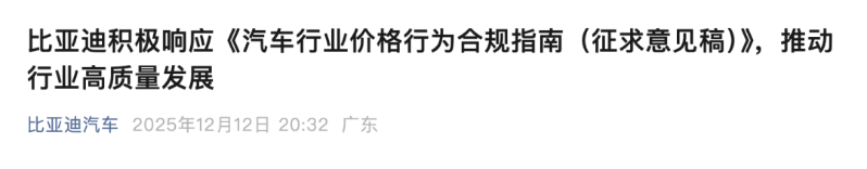 12月12日晚间,比亚迪表态积极响应《汽车行业价格行为合规指南(征求意见稿)》。
