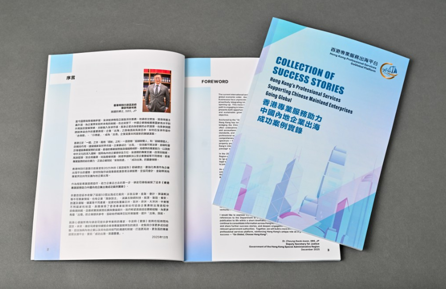 ▲律政司昨日(13日)在“香港专业服务出海平台”启动礼上公布所编撰的《香港专业服务助力中国内地企业出海成功案例实录》。政府新闻处