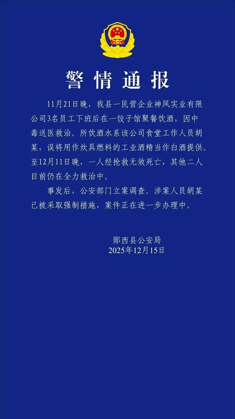 首页>时事 湖北郧西通报“3名员工下班聚餐饮酒因中毒送医救治”:一人抢救无效死亡 发布时间:2025-12-16 09:27 12月15日,郧西县公安局发布警情通报: 来源︱平安郧西 编辑︱林木 热门文章 黎智英案丨黎智英两项串谋勾结外国势力及串谋发布煽动刊物罪罪成 公然同“台独”分裂势力勾连,外交部发布对岩崎茂采取反制措施的决定 大陆机器铁哨兵免带枪?栗正杰揭“3秒引炮火”内幕 外交部披露:菲方人员持刀威胁中方现场维权执法海警 蓝营中市长姊弟之争,江启臣正面迎战,卢秀燕最新回应曝 赖清德称解放军2027年前具备夺台能力,国防部回应 深圳市政协原主席戴北方,被查 马斯克:太阳是巨大的免费聚变反应堆,在地球上造“微型版”太愚蠢 广西百色教师性侵学生案一审宣判:唐毓文获刑18年 朱雀三号总指挥谈火箭首飞:最后一脚刹车没踩好,经历失败才可能走得更远 专题 更多 >