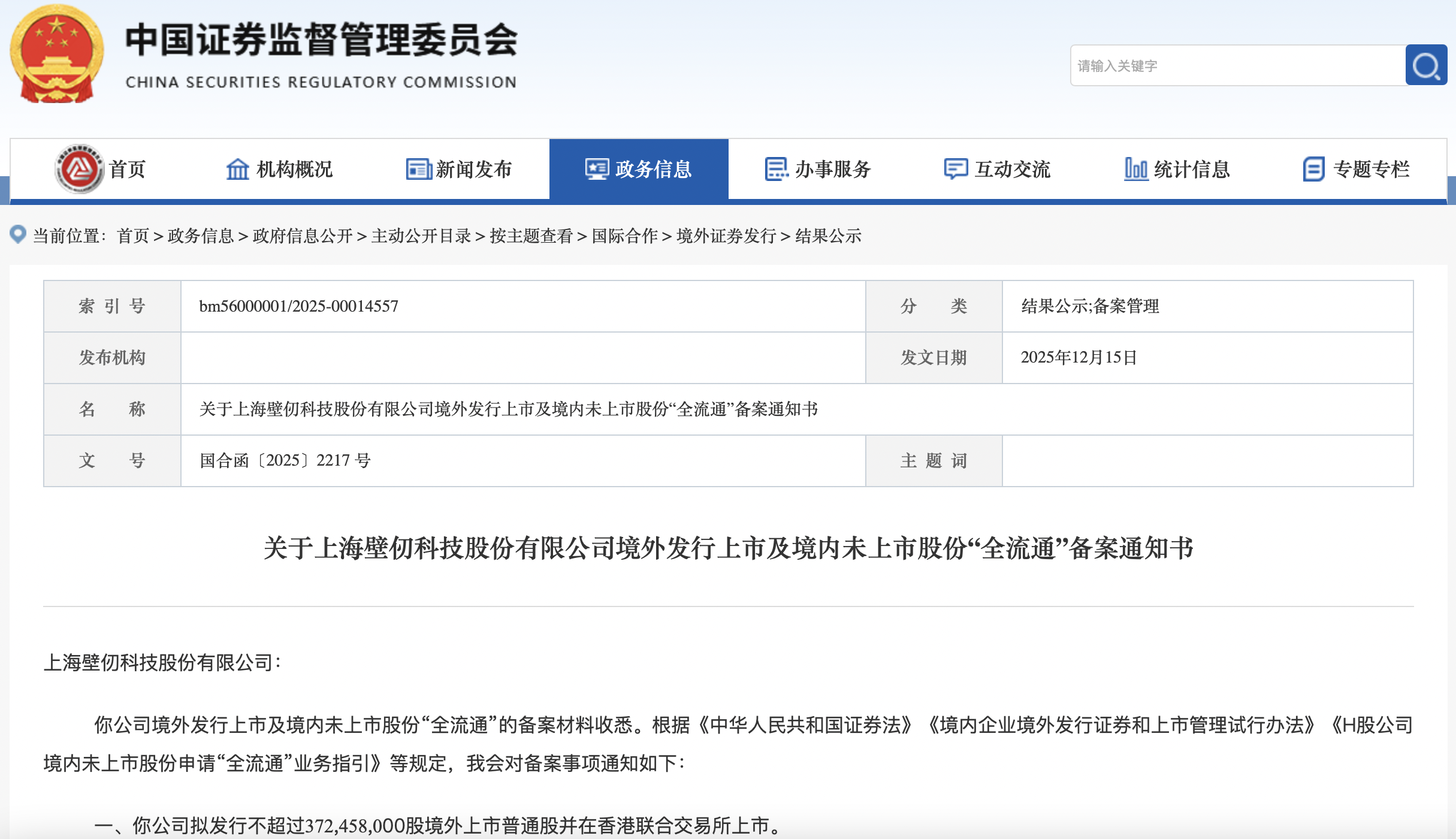 12月15日,据证监会官网披露,上海壁仞科技股份有限公司(以下简称“壁仞科技”)境外发行上市及境内未上市股份“全流通”的备案材料收悉,公司拟发行不超过372,458,000股境外上市普通股并在香港联合交易所上市。