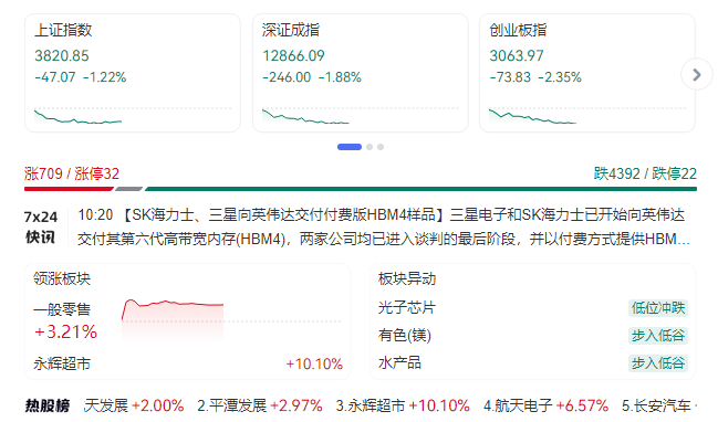 12月16日消息,早盘三大股指低开低走,创指跌超2%;科创50跌超2%。截至收盘,沪指报3820.85点,跌1.22%;深证成指报12866.09点,跌1.88%;创指报3063.97点,跌2.35%。