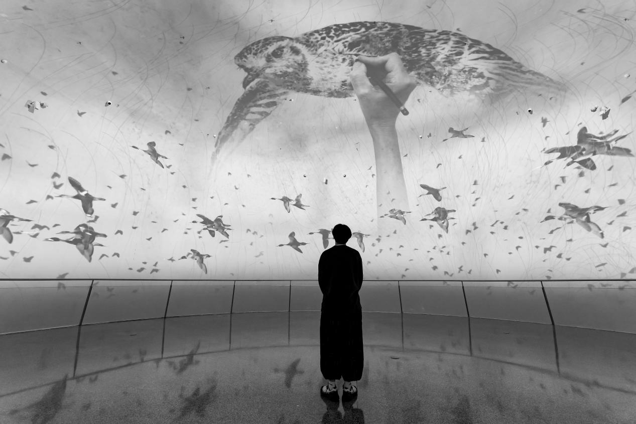 此次展览展厅空间直径21米、高15米,不仅呼应了镌刻在深圳天空上史前候鸟的迁徙路线,也成为深圳湾文化广场新的委创标签。