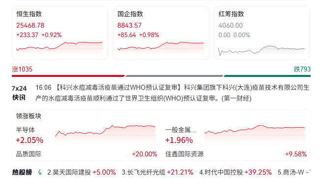 12月17日消息,港股三大指数高开高走。截至收盘,恒生指数涨0.92%,报25468.78点,恒生科技指数涨1.03%,国企指数涨0.98%。