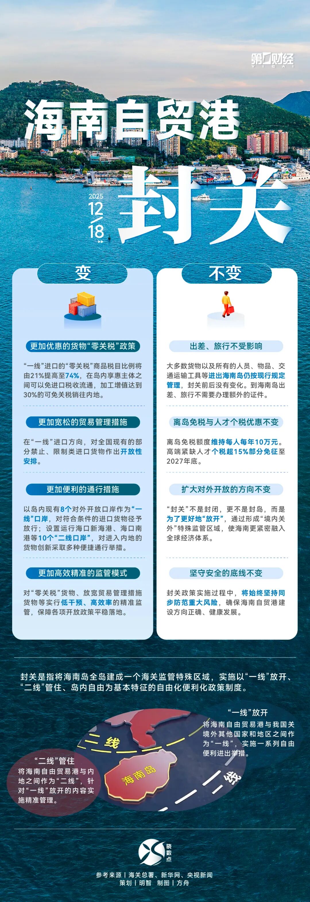 首页>时事 海南自贸港封关,有哪些“变”与“不变”?一图看懂 发布时间:2025-12-17 19:19 海南自由贸易港将于12月18日起正式启动全岛封关。封关“封”的是什么?有哪些“变”与“不变”?一图看懂。相关链接:海南封关需要知道的10件事 来源︱第一财经 编辑︱梁景琴 热门文章 外媒列出所谓“最佳攻台时间”和“最佳登陆地点”,国台办回应 王毅最新涉日表态 李家超述职︱向习近平汇报四方面,称香港将推行系统性改革,不允许大埔火灾悲剧重演 翁晓玲呛砍赖清德、卓荣泰薪水,赖清德反应曝光 柯文哲呛大罢免大失败“检察官重要”:至少有5%去投票 日本将在冲绳部署雷达,专家:窥探西南配合进攻兵力部署,引导战机和导弹瞄准打击别国海空目标 高虹安二审无罪,刘世芳曝进度:已收到回复市长职务的公文 中国首父︱网游富豪徐波靠代孕生逾百子,美法院驳回多宗父母权申请 AMD苏姿丰到访中国,率高管团队亲临联想全球总部 绿营桃园市议员提名缩水,基层炸锅:“保送”张善政 专题 更多 >