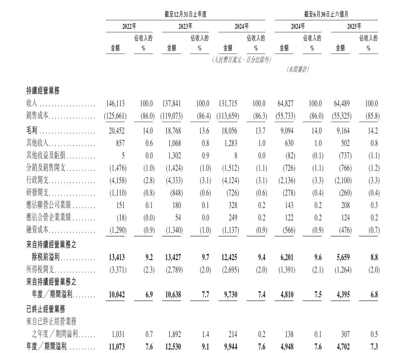 于2022年度、2023年度、2024年度、2025年截至6月30日止六个月,公司分别录得收入1461.13亿元、1378.41亿元、1317.15亿元以及644.89亿元。