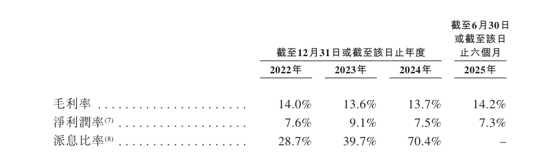 于2022年度、2023年度、2024年度、2025年截至6月30日止六个月,公司对应毛利润率为14%、13.6%、13.7%、14.2%。