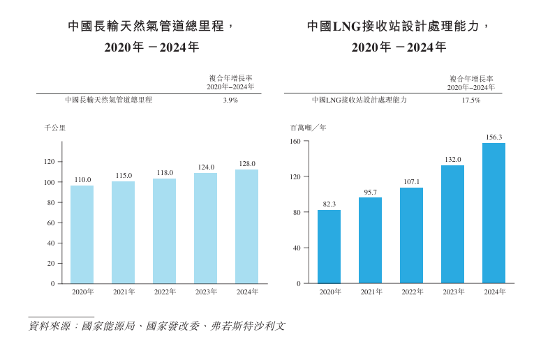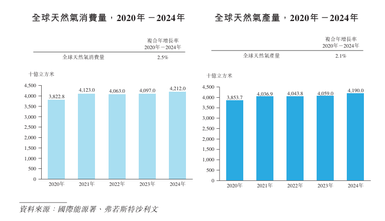 在供给端,全球天然气产量从2020年的约38,537亿立方米增长至2024年的约 41,900亿立方米,复合年增长率约2.1%。中国天然气产量从2020年的1,925亿立方米增长至2024年的2,464亿立方米,复合年增长率约6.4%。