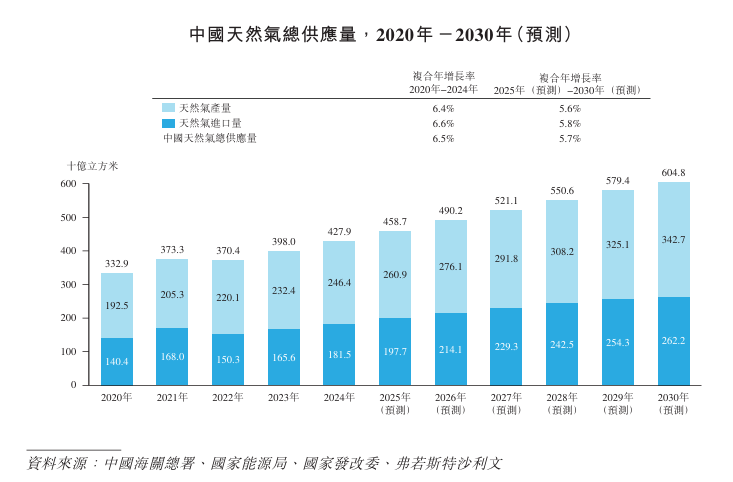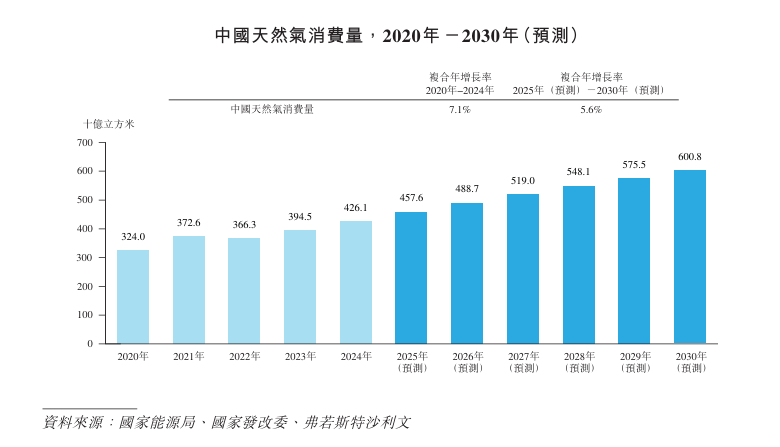 2024年,随着中国天然气供给端的不断完善,中国天然气消费量从2020年的约3,240亿立方米增长至2024年的约4,261亿立方米,复合年增长率为约7.1%。中国天然气下游消费结构呈现出由依靠居民增长驱动,转向以工商业和电厂为主的增长驱动趋势。预计中国天然气消费量将于2030年增长至约6,008亿立方米。