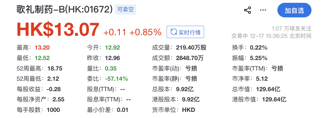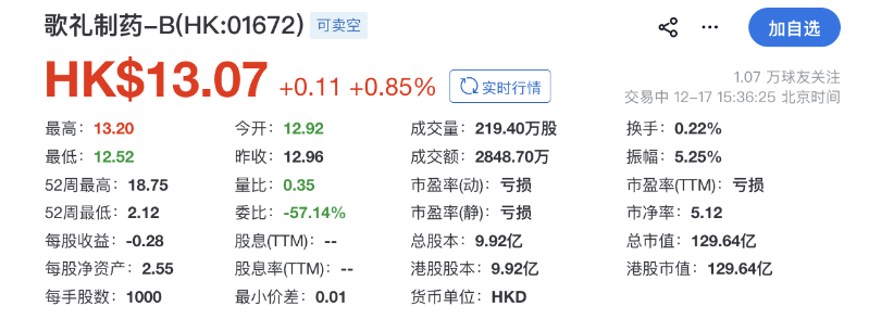 歌礼制药于2018年8月1日在香港上市,为香港第一家上市的18A未盈利生物科技公司。截至发稿,歌礼制药股价涨0.85%,报13.07亿港元,总市值129.64亿港元。