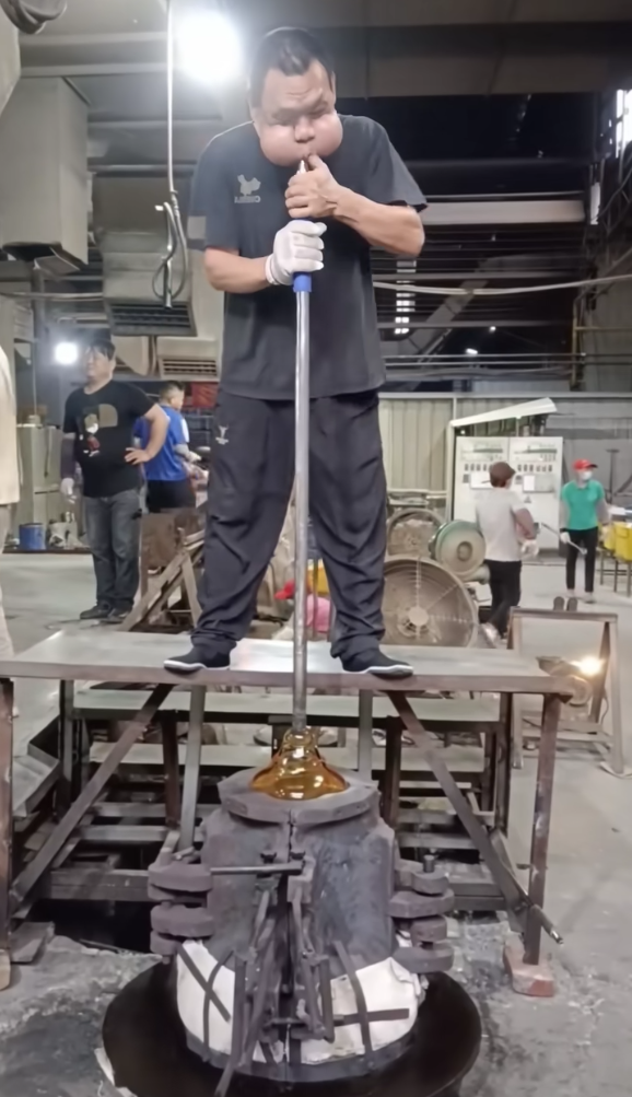 据悉,吹玻璃时工人需要持续用力向熔融玻璃中吹气以塑造形状,是一项对肺活量和面部肌肉要求极高的工作。